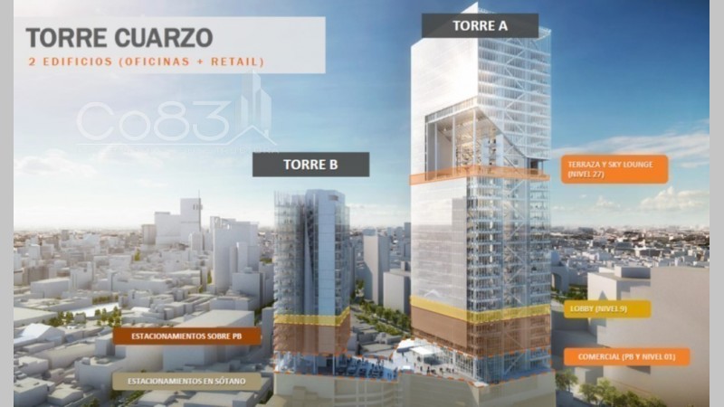 • TORRE B: 30 niveles / 20 niveles para oficinas • Lobby en el piso 9 • 2 niveles para locales comerciales • Terraza y Sky Lounge en el piso 27 (Torre A) • 56,689 m2 rentable